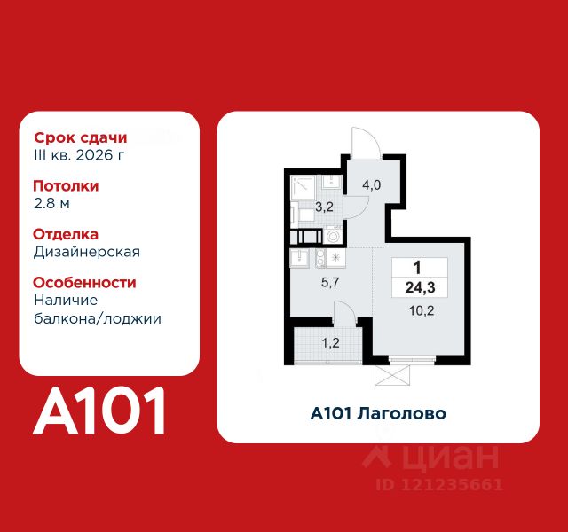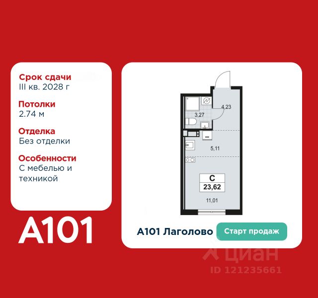 Старт продаж! Студия площадью 23.61 в ЖК "А101 Лаголово" на 4 этаже. Квартира без отделки. Вид из окна во двор. В квартире 1 санузел. Высота потолков 2.74 м. Предложения от застройщика на декабрь 2025: - Гибкая рассрочка 20 000 руб/мес. и первым взносом 10%. ОТДЕЛКА Квартира передается без отделки. Благодаря тому, что в данном типе отделки стены не возводятся, вы сможете создать удобную планировку и самостоятельно организовать зонирование комнат. ПАРАДНАЯ. В каждой парадной предусмотрены места для хранения велосипедов и колясок, гостевой санузел и удобная зона ожидания для гостей. ДВОРЫ И ОКРУЖЕНИЕ. Просторные дворы безопасны для детей, так как свободны от машин, закрыты от посторонних и постоянно находятся под видеонаблюдением. Во дворах создается разнообразная среда для детей всех возрастов: детские площадки с батутами, тактильными дорожками и игровыми комплексами. Для активного отдыха - воркаут-площадки, столы для пинг-понга и газоны для занятий йогой. Во дворах есть и тихие уголки - зеленые гостиные с уличной мебелью, где можно поработать на свежем воздухе или отдохнуть в тишине. Из внутренних дворов комплекса можно выйти на пешеходный бульвар длиной около 900 метров. Здесь будет организовано полноценное общественное пространство с амфитеатром, уличным кафе, ручьем, фонтаном и множеством мест для отдыха и игр. Большую часть бульвара займут благоустроенные зеленые зоны и теневые сады из десятков видов деревьев и кустарников, многолетних цветов и трав, которые будут радовать глаз круглый год. "А101 Лаголово" - современный город у подножия знаменитых Дудерговских высот, в объятиях чистейших озер и зеленых живописных массивов, наполненный всем необходимым для счастливой жизни. ИНФРАСТРУКТУРА. Мы занимаемся комплексным освоением территории. Наш приоритет - доступность всех сервисов для счастливой жизни. 1. Лаголово-город 15-ти минутной доступности. Вся необходимая инфраструктура: магазины, салоны красоты, образовательные учреждения, медицинские центры находятся в 15-ти минутах пешей прогулки от любой точки жилого комплекса. Это позволяет не тратить время на долгие перемещения. 2. Представьте идеальный город, где ребенок может спокойно играть, а пожилой человек наслаждаться заслуженным отдыхом. Жилая среда нашего комплекса может комфортно использоваться как 8-летним ребенком, так и 80-летним пожилым человеком. Дома, улицы, общественные пространства, тротуары спроектированы с заботой о людях разных возрастов. 3. Мы активно развиваем авторскую образовательную экосистему "Лёрнити". Она включает строительство 8 современных детских садов (2000 мест) и 3 школ (2945 учащихся). Мы учим родителей гармонично общаться с детьми, помогаем малышам подготовиться к школе, а подросткам - выбрать будущую профессию и развить таланты. Не хватает средств на покупку кладового помещения? Оформите ипотеку на квартиру и добавьте к ней часть стоимости кладовой. ЗАСТРОЙЩИК ГК "А101" - крупный инвестиционно-строительный холдинг, занимает 6-е место по объему стро