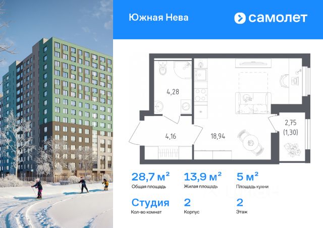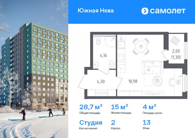 Строим кварталы для жизни с заботой о будущем. Предлагается квартира студия комфорт-класса 27,19 кв.м в корпусе 2 на 11 этаже, в ЖК "Южная Нева" Квартира без отделки. Доступность опции "отделка" и возможность комплектации мебелью и декором уточняйте у застройщика. Приобрести квартиру возможно по специальным акциям от застройщика, с текущими условиями акций можно ознакомиться в блоке "Акций". Цена динамическая и может отличаться, уточняйте актуальность у застройщика. Спокойное течение Невы, монументальные арки Володарского моста и простор лесопарка создают атмосферу жилого комплекса "Южная Нева". До КАДа — всего 5 минут, до центра города — 30 минут на машине, а станция метро "Пролетарская" в 10 минутах. Для любителей природы рядом Невский лесопарк и "МЕГА Парк", где можно бегать, кататься на велосипеде или посетить веревочный парк. Для детей предусмотрены школа и 2 детских сада, а на первых этажах домов откроются салоны красоты, магазины и кафе. В шаговой доступности — фитнес-центр и торговые центры "МЕГА Дыбенко" и "Лондон Молл". Комплекс состоит из 11 монолитных домов высотой от 12 до 23 этажей с разноцветными фасадами и панорамными балконами. Двор украшают 7 мостов-навесов, а центральная аллея — собственная Нева. Здесь можно позагорать на лежаках или поиграть в шахматы, позаниматься на спортивной площадке или отвести ребенка в игровую зону на встречу с друзьями. В "Южной Неве" есть планировки с проходными кухнями-гостиными и гардеробными.