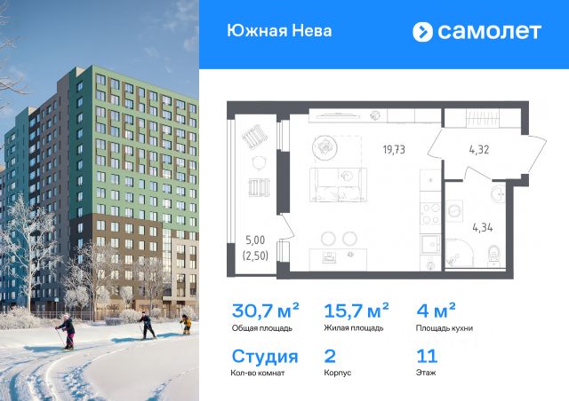 Строим кварталы для жизни с заботой о будущем. Предлагается квартира студия комфорт-класса 27,19 кв.м в корпусе 2 на 11 этаже, в ЖК "Южная Нева" Квартира без отделки. Доступность опции "отделка" и возможность комплектации мебелью и декором уточняйте у застройщика. Приобрести квартиру возможно по специальным акциям от застройщика, с текущими условиями акций можно ознакомиться в блоке "Акций". Цена динамическая и может отличаться, уточняйте актуальность у застройщика. Спокойное течение Невы, монументальные арки Володарского моста и простор лесопарка создают атмосферу жилого комплекса "Южная Нева". До КАДа — всего 5 минут, до центра города — 30 минут на машине, а станция метро "Пролетарская" в 10 минутах. Для любителей природы рядом Невский лесопарк и "МЕГА Парк", где можно бегать, кататься на велосипеде или посетить веревочный парк. Для детей предусмотрены школа и 2 детских сада, а на первых этажах домов откроются салоны красоты, магазины и кафе. В шаговой доступности — фитнес-центр и торговые центры "МЕГА Дыбенко" и "Лондон Молл". Комплекс состоит из 11 монолитных домов высотой от 12 до 23 этажей с разноцветными фасадами и панорамными балконами. Двор украшают 7 мостов-навесов, а центральная аллея — собственная Нева. Здесь можно позагорать на лежаках или поиграть в шахматы, позаниматься на спортивной площадке или отвести ребенка в игровую зону на встречу с друзьями. В "Южной Неве" есть планировки с проходными кухнями-гостиными и гардеробными.