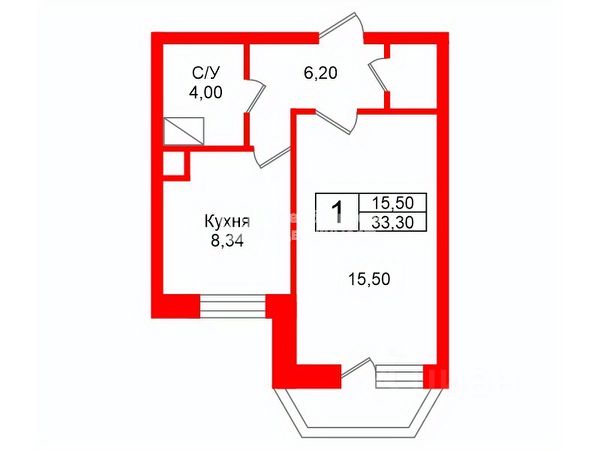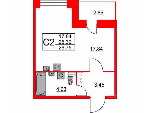 Общая площадь 23  м. кв., из них: комната 16,9 м. кв., прихожая 2,6 м кв, санузел 3,5 м кв. Дополнительно просторная лоджия 7,4 м кв.