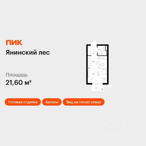Продаётся квартира-студия площадью 20,9 кв.м на 6 этаже 15 этажного дома (Корпус 4, Секция 1) проекта ПИК Янинский лес. Светлый просторный подъезд на уровне земли, функциональная планировка, большие окна, c отделкой. Жилой квартал "Янинский лес" возводится в районе Янино-1 Ленинградской области. Автобусная остановка находится в 3 минутах пешком. Проект расположен вплотную к восточной границе Санкт-Петербурга - в 4 минутах от КАД. До метро "Ладожская" - 23 минуты на общественном транспорте. До исторического центра города можно доехать за 25 минут на автомобиле. "Янинский лес" - масштабный проект из 32 жилых корпусов, где будет всё для комфортной жизни. Здесь предусмотрены надземные паркинги, откроются детские сады, школа и поликлиника. Кроме этого, появятся места, в которых можно проводить свободное время: ледовая арена и торговый центр площадью больше 3000 м². Жилой район строится по всем правилам ПИК-Стандарта: в зелёных дворах-парках появятся современные детские и спортивные площадки, пешеходный бульвар и другие места для отдыха. На первых этажах разместятся магазины, кафе и другие сервисы. Во дворах не будет автомобилей, а для гостей предусмотрены парковочные места. Проект окружают лесные массивы. В пешей доступности находится Ржевский лесопарк: летом там можно гулять и собирать грибы, а зимой кататься на лыжах. Также рядом расположен памятник природы Колтушские высоты - парк с обустроенными экотропами и веломаршрутом. А главное место притяжения местных жителей - озеро с обустроенным местом для пикников. Артикул 1049722 (Застройщик ООО "СПЕЦИАЛИЗИРОВАННЫЙ ЗАСТРОЙЩИК"ЭКСТРАГРАД") [cn_sbp_1848307]