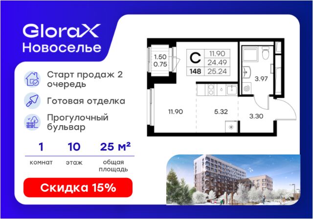 Продаётся квартира-студия площадью 25,94 кв.м на 7 этаже 12 этажного дома (Корпус 4.1, Секция 1) проекта ПИК Таллинский парк. Светлый просторный подъезд на уровне земли, функциональная планировка, большие окна, без отделки. "Таллинский парк" - проект в Ленинградской области, в районе Новоселье. До станции метро "Проспект Ветеранов" - 15 минут на автомобиле, а до КАД можно доехать всего за 4 минуты. "Таллинский парк" включает 16 жилых домов, детский сад и школу. В проекте появится центральный сквер с обильным озеленением, а через весь квартал протянутся широкие пешеходные бульвары. В зелёных дворах-парках будут оборудованы современные детские и спортивные площадки, обустроены места для отдыха. На первых этажах разместятся магазины, кафе и другие сервисы. Проектом предусмотрены персональные кладовые помещения - это доступный, экономичный и удобный способ хранения сезонных и крупногабаритных вещей. Освободите свою квартиру для полноценной жизни. Район Новоселье активно развивается в городском формате: здесь уже работают детские сады, школа и магазины. Для любителей зимних видов спорта открыта круглосуточная ледовая арена Ice Rink. За покупками и развлечениями также можно быстро доехать: 10 минут - и вы в Аутлете Fashion House Таллинское, гипермаркетах Лента, Леруа Мерлен и Окей. В 10 минутах на автомобиле находится Финский залив, на берегу которого расположились объекты культурного наследия. Рядом - Константиновский парк с отреставрированным дворцом, а чуть дальше расположена усадьба Знаменка. В великолепном Петергофе вы будете уже через 20 минут. Артикул 1026151 (Застройщик ООО "СПЕЦИАЛИЗИРОВАННЫЙ ЗА СТРОЙЩИК "СТРОЙ-ЭКСПЕРТ ") [cn_sbp_1826009]