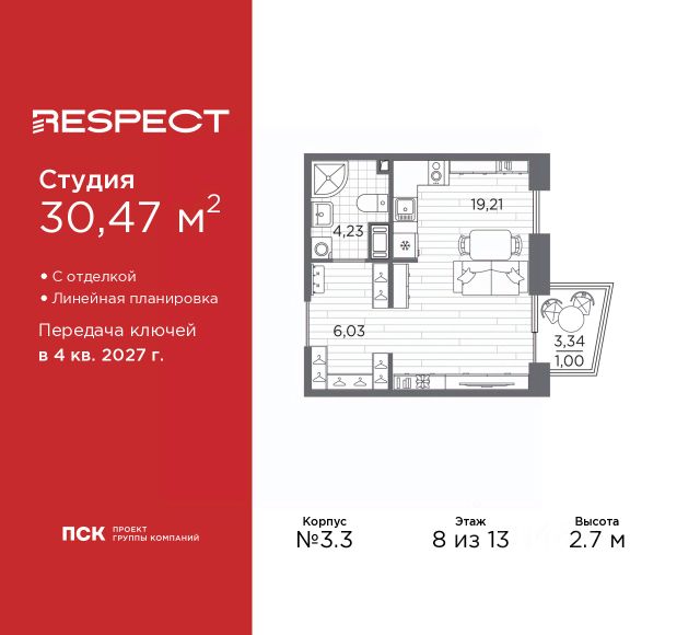 1-комн. квартира-студия с предчистовой отделкой в ЖК "RESPECT" на 8 этаже. Общая площадь: 32.8 кв.м., площадь гостиной 20.8 кв.м., из которых 5 кв.м. выделено под кухонную зону. Все окна выходят на одну сторону. В квартире один балкон, один совмещенный санузел. Высота потолков 2.7 м. Дом монолитный, многоподъездный, переменной этажности, от 10 до 13 этажей. Квартира находится в 1-й секции высотой 13 этажей в корпусе 3.2. На этаже 5 квартир. В подъезде 1 пассажирский и 1 грузовой лифт. Начало строительства - 3 квартал 2025 года. Окончание строительства - 4 квартал 2027 года. Оформление сделки по договору долевого участия. В шаговой доступности от жилого комплекса имеются станции метро (расстояние по прямой): "Лесная" (800 м), "Площадь Мужества" (1.4 км), "Выборгская" (1.9 км), также недалеко от этого корпуса расположены станции метро: "Академическая", "Политехническая". Жилой квартал "RESPECT" строится на Полюстровском пр, 87, в одной из самых востребованных локаций Петербурга. В 10 минутах пешком - метро "Лесная" и в 10 минутах на транспорте - Петроградская сторона. Высота домов от 7 до 13 этажей. Квартиры сдаются с отделкой white box и с чистовой отделкой. На территории Respect строится школа на 1125 учащихся и детский сад на 240 мест. Запроектированы собственная газовая котельная, закрытая территория, дворы без машин и подземные паркинги с лифтами. В проекте предусмотрены трапециевидные балконы или остекленные лоджии, которые, с одной стороны, исключают монотонность фасада, являясь декоративными элементами, с другой дополнительным функциональным пространством в квартирах. Цветовая гармония фасадов каждого дома раскрывает характер квартала. Коричневый цвет клинкерного кирпича со структурой водяных штрихов — цвет уюта и безопасности, сдержанности и надёжности. Вентилируемые фасады облицованы клинкерным кирпичом. Его высокая прочность позволяет давать 100 лет гарантии на этот материал. Водопоглощение клинкерного кирпича составляет менее 5%, за счет чего у него высокая теплопроводность и прочность. В квартале запроектированы внутренние закрытые территории дворов домов без доступа автомобилей и безбарьерная среда для велосипедистов и колясок. Предусмотрены IP-домофония с функцией дистанционного открывания калиток и парадных, а также дистанционный сбор показаний счетчиков и мобильное приложение для жителей. Для безопасности жителей квартала - круглосуточное видеонаблюдение и служба охраны. В каждой квартире предусмотрены внешние корзины для кондиционеров. Вся территория квартала будет связана единой концепцией благоустройства, разработанной ландшафтным бюро L.BURO. На эксплуатируемой кровле на уровне первого этажа в домах 1 и 4 будут обустроены общественные видовые террасы. Это станет не только привлекательным местом с красивым видом, но и удобным, многофункциональным пространством. Дизайн парадных зон и входных групп - сочетание лаконичности отделки и декоративных элементов с текстурами из натурального камня и дерева с приглу
