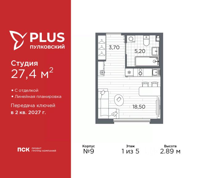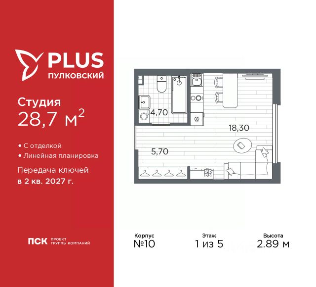 Продается 1-комн. квартира-студия с отделкой в ЖК "PLUS Пулковский" на 2 этаже. Общая площадь: 26.4 кв.м., площадь гостиной 16.8 кв.м., из которых 5 кв.м. выделено под кухонную зону. Все окна выходят на одну сторону. В квартире один совмещенный санузел. Высота потолков 2.89 м. Дом монолитный, трехподъездный, высотой 5 этажей. Квартира находится в 3-й секции в корпусе 10. На этаже 6 квартир. В подъезде 1 грузовой лифт. Окончание строительства - 2 квартал 2027 года. Оформление сделки по договору долевого участия. ЖК "PLUS Пулковский" расположен в престижном Московском районе на пересечении Пулковского и Волхонского шоссе, по которым можно быстро добраться до КАД и до станций метро Московская и Звёздная. Поблизости расположены дворцово-парковые ансамбли Пушкина, Павловска, Петергофа, Гатчины, Ломоносова, а также вся торговая и развлекательная инфраструктура: ТК Лето, Outlet Village Pulkovo, Пулково-3, гипермаркеты Лента, Окей, Metro. На территории комплекса будут построены средняя образовательная школа на 825 мест с двумя бассейнами, 2 детских сада на 220 мест каждый. В детских садах тоже будут бассейны. Кроме этого будет построен медицинский центр для взрослых и детей. Во дворах буду оборудованы спортивные и безопасные детские площадки, на первых этажах домов будут расположены коммерческие помещения. Для автолюбителей будут подземные и наземный паркинги. Для жителей домов будет доступно "приложение жителя", которое предоставит такие возможности: — дистанционное открытие дверей в парадную и на территорию комплекса, — просмотр изображений с видеокамер, — контроль за показаниями счетчиков, — коммуникация с УК. Показания всех счетчиков будут собираться дистанционно. В квартирах будет выполнена коллекторная разводка отопления в стяжке пола от коллекторов в межквартирных коридорах. Застройщик ЖК "PLUS Пулковский" - группа компаний ПСК, которая является одной из ведущих девелоперских компаний Санкт Петербурга. Более 16 лет она возводит в Северной столице качественное жилье премиум, бизнес и комфорт-класса, социальные объекты школы и детские сады, апарт-комплексы и торговые центры и является четырехкратным обладателем золотого знака "Надежный застройщик России". #zMBwcM