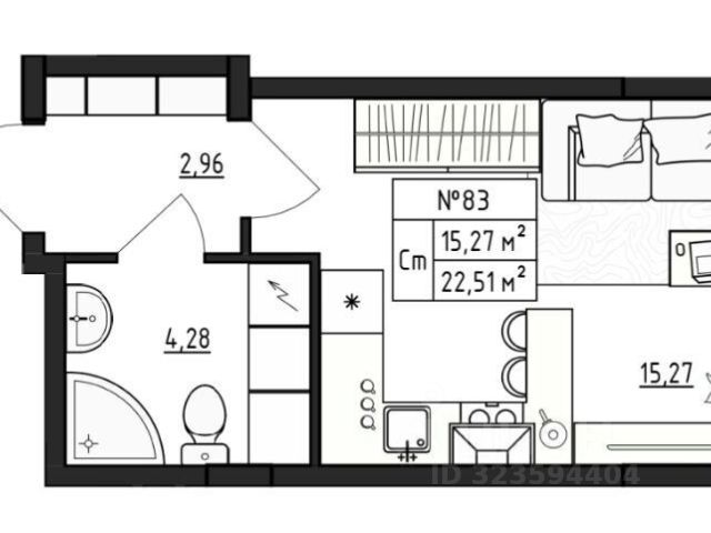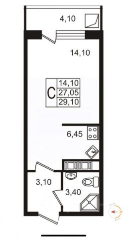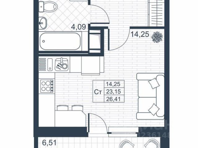 Квартира-студия, общей площадью 26,41 м², жилая площадь 14,25 м², прихожая - 4,81м², санузел - 4,09 м², балкон - 6,51 м².