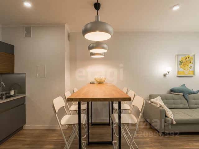Апартамент полностью укомплектован мебелью и техникой. Премиальный ламинат, кафель, сантехника и тд, всё сделано из долговечных, красивых и тактильно приятных материалов