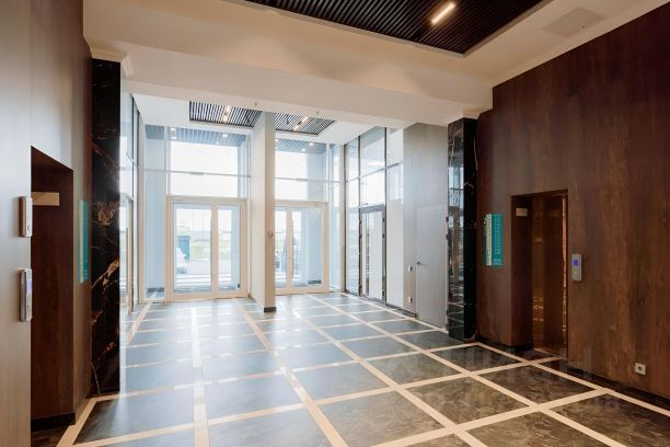 Чистая парадная оборудованная пассажирскими и грузовым лифтами