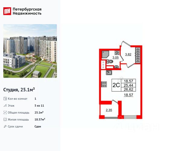 О квартире: общ площадь 24,7 кв.м, площадь комнаты с кухней 17,7 кв.м., совмещенный санузел 3,1 кв. м., прихожая 3,0 кв. м., лоджия 2,6 кв.м. Высота потолка 2,75 м. Квартира расположена на 5 этаже 11-этажного дома.