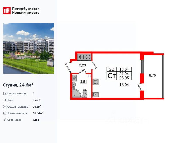 Продается уютная студия в современном доме на Пулковском шоссе, 95к3, Санкт-Петербург. Общая площадь квартиры составляет 26.95 кв. м, жилая площадь - 18.04 кв. м. Квартира находится на 3-м этаже 5-этажного монолитно-кирпичного дома, который был построен в 2024 году. Высота потолков - 2.77 метра. Для вашего удобства в доме есть пассажирский и грузовой лифты, а также подземная парковка. В квартире сделан качественный евроремонт, что позволяет сразу заехать и жить. Планировка студии удобна и функциональна, есть совмещенный санузел и лоджия, окна выходят во двор, что обеспечивает тишину и спокойствие. Дом расположен в районе с хорошо развитой инфраструктурой. Рядом находятся школы, детские сады и магазины, что делает эту квартиру отличным выбором для семей и тех, кто ценит удобство городской жизни. Метро "Звездная" находится в 19 минутах на автомобиле, что обеспечивает хорошую транспортную доступность и быстрый доступ к центру города. Условия сделки: продажа осуществляется по договору купли-продажи. Возможна ипотека. Квартира без обременений, полная юридическая чистота. Приглашаем вас на просмотр этой прекрасной студии. Записывайтесь на удобное для вас время, и мы с удовольствием покажем вам ваш будущий дом!