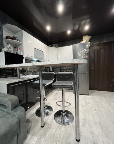 - вся кухня с индукционной варочной поверхностью, вытяжкой, посудомойкой и дорогой керамогранитной раковиной, холодильник мятного цвета в тон с кухней, подсветка в рабочей зоне включается по технологии взмах руки;