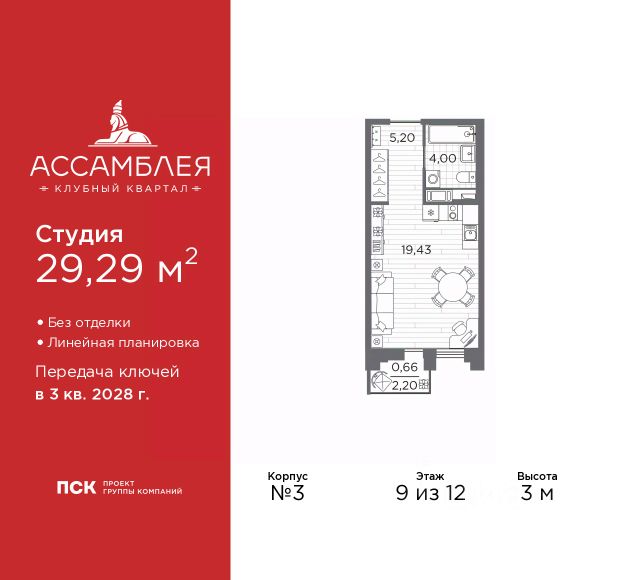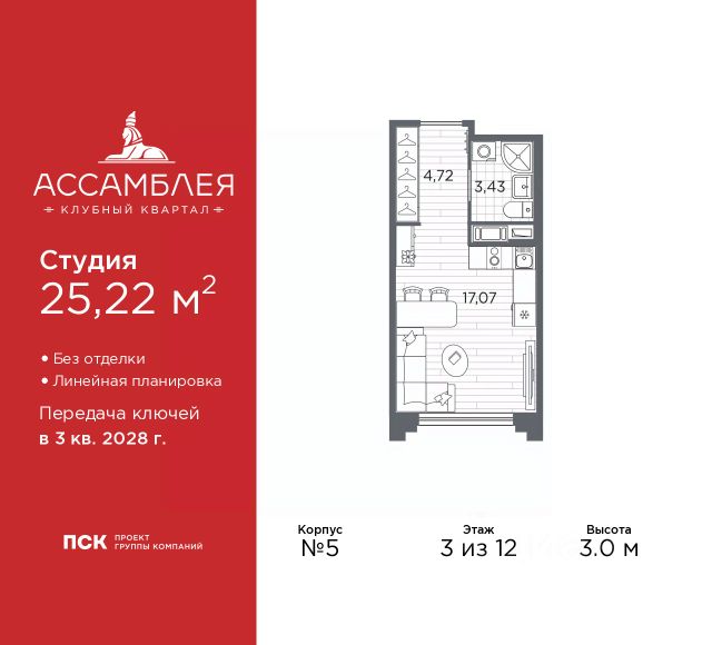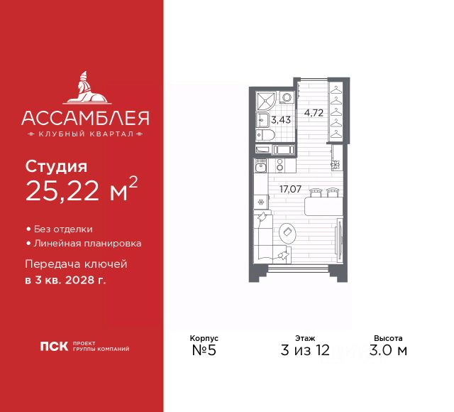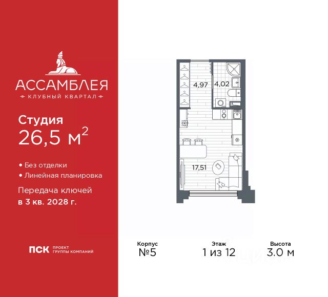 1-комн. квартира-студия от застройщика в Клубный квартал "Ассамблея" на 3 этаже. Квартира без отделки, полностью готова к ремонту. Общая площадь: 41.41 кв.м., площадь гостиной 31.6 кв.м., из которых 10 кв.м. выделено под кухонную зону. Все окна выходят на одну сторону. В квартире один совмещенный санузел. Высота потолков 3.0 м. Дом монолитный, черырехподъездный, высотой 12 этажей. Квартира находится в 4-й секции в корпусе 5. На этаже 10 квартир. В подъезде 1 пассажирский и 1 грузовой лифт. Окончание строительства - 3 квартал 2028 года. Оформление сделки по договору долевого участия. В шаговой доступности от жилого комплекса расположены станции метро (расстояние по прямой): "Горный институт" (1.0 км), "Василеостровская" (1.4 км), "Приморская" (1.5 км), также недалеко от этого корпуса расположены станции метро: "Спортивная", "Чкаловская". "Клубный квартал Ассамблея" — проект бизнес-класса на Васильевском острове, в самом сердце исторического Петербурга. Комплекс состоит из пяти корпусов переменной этажности — от 7 до 12 этажей — с выразительной архитектурой в стиле неомодернизма: светлый клинкер, панорамное остекление, просторное лобби с потолками высотой почти 8 метров. Потолки — до 3,2 метров. Подземный паркинг на 667 машиномест. Комфорт и инфраструктура Проект ориентирован на комфортную городскую жизнь. В закрытом дворе — ландшафтное озеленение, современные детские и спортивные площадки. Внутренний клуб для резидентов включает коворкинг, переговорные, кинозал, фитнес и бьюти-зону. IP-домофония с просмотром камер видеонаблюдения, дистанционное открывание дверей и доступа на территорию и в парадную со смартфона и планшета, просмотр показаний счетчиков, приложение для жителей PSK Home. Локация Расположение на Васильевском острове — сильная сторона проекта. До четырех станций метро ("Горный институт", "Василеостровская", "Спортивная", "Приморская") — 515 минут пешком. В шаговой доступности — зелёные зоны, культурные учреждения, в том числе сад "Василеостровец" и ДК имени Кирова. Основные магистрали Большой, Средний и Малый проспекты, Наличная и Уральская улицы. Съезд на ЗСД расположен недалеко от станции метро "Приморская", близ береговой линии. Благовещенский и Дворцовый мосты соединяют остров с центром города, а мосты Тучков, Биржевой и Бетанкура — с Петроградской стороной. Застройщик Группа компаний ПСК является одной из ведущих девелоперских компаний Санкт Петербурга. На протяжении 18 лет она возводит в Северной столице качественное жилье премиум, бизнес и комфорт-класса, социальные объекты школы и детские сады, апарт-отели и торговые центры. Является шестикратным обладателем золотого знака "Надежный застройщик России". #zMBgeS