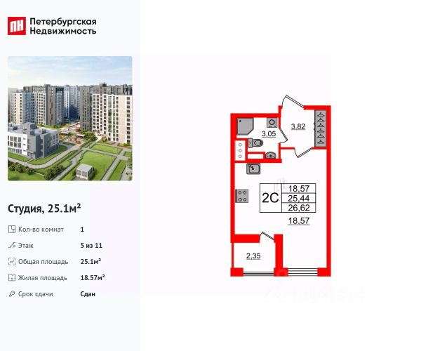 Продается просторная студия в жилом комплексе "Автограф в центре" во Фрунзенском районе. До метро можно добраться пешком всего за 15 минут. Удобная, классическая, функциональная европланировка, просторная прихожая 3.82 м². Общая площадь студии - 25.1 м², жилая 18.57 м², высота потолка 2.75 м. Квартира продается с отделкой "Итальянские коллекции (высокий комфорт)(в)". Что особенного в ЖК "Автограф в центре"? • Приватный жилой комплекс в центре Петербурга, в шаговой доступности от метро • Экопарк во дворе - лучший проект зоны отдыха в составе ЖК • Детский сад и собственный клуб для детей в жилом комплексе • Семейные секции и кладовые • Уникальные планировки квартир (с террасами, саунами, мастер-спальнями и High Flat)