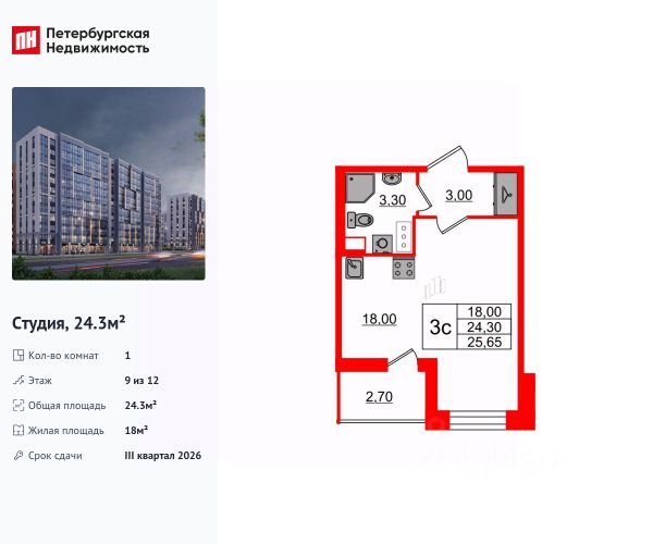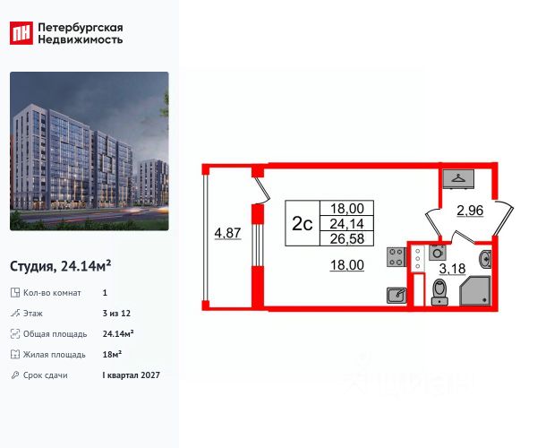 Продается просторная студия от застройщика в жилом комплексе "Бионика Заповедная" в динамичном Приморском районе. До метро можно добраться на транспорте всего за 11 минут. Удобная, классическая, функциональная европланировка, вместительная прихожая 2.96 м². Общая площадь студии - 24.65 м², жилая 18 м², высота потолка 2.77 м. Квартира продается с отделкой "Норд Лайн светлый плюс". Что особенного в ЖК "Бионика Заповедная"? • Оазис в городе 3 минуты пешком до Новоорловского заказника (140 ГА) • Захватывающие виды из окон на хвойный лесопарк • Всесезонный "Заповедный парк" во дворе площадью 23000 кв.м. • 5 единых входных групп с авторским дизайном и лаундж-зонами, сити-виллы на первых этажах с палисадниками и высотой потолков до 4 м • Места притяжения: фонтан "Бионика", спортивный кластер со скейт-парком, фотозоны с арт-объектами