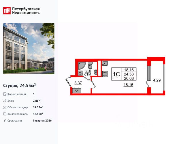Продается уютная студия от застройщика в жилом комплексе "Дворцовый фасад" в неповторимом Петродворцовом районе. До метро можно добраться на транспорте всего за 25 минут. Удобная, классическая, функциональная европланировка, вместительная прихожая 3.02 м². Общая площадь студии - 24.3 м², жилая 18 м², высота потолка 2.75 м. Квартира продается с отделкой "Норд Лайн серый". Что особенного в ЖК "Дворцовый фасад"? • В окружении дворцово-парковых ансамблей: Стрельна, Константиновский дворец, Петергоф, парк Новознаменка и Сосновая поляна, Шунгеровский лесопарк • Два собственных парка: парадный верхний для спокойного отдыха, нижний для активных занятий • Проект, соответствующий стандартам экологичного строительства, энергоэффективности, экономии и комфорта • Квартиры с саунами, возможностью установки камина и палисадниками • Малоэтажный жилой комплекс: всего 4 этажа, более половины квартир с увеличенной высотой потолка: от 3 до 5,5 м