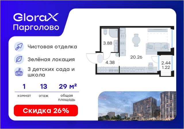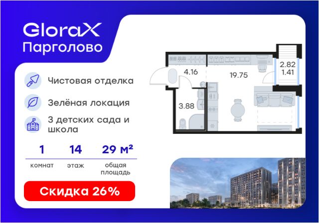 Продается квартира-студия на 3-м этаже в проекте комфорт-класса GloraX Парголово. Общая площадь лота составляет 29,02 кв. м, из которых 19,75 кв. м отведено под жилую и кв. м под кухонную зону. Номер квартиры - 154. Преимущества: - Квартира комфорт-класса - Зеленый район, Шуваловский парк в 20 мин. пешком - 10 мин. до КАД, 15 мин. до ЗСД - 5 эт. паркинг на 451 м/м - Закрытые дворы с видеонаблюдением - Детские площадки с геопласткой и бизиборадми - Сады и школы в шаговой доступности - Спортивные площадки и велодорожки - Собственный комьюнити-центр - Келлеры для хранения - Коммерческие помещения на 1 этажах GloraX Парголово — масштабный проект комфорт-класса в Выборгском районе Санкт-Петербурга. Место, продуманное до мелочей, где все, что необходимо — рядом. Архитектурно-пространственное решение отличается лаконичностью и строгостью и придает проекту свой характер. Внутренние дворы закрыты от внешнего мира, создавая приватную территорию для жителей. Живите на природе, но с комфортом мегаполиса. Десять минут на велосипеде или полчаса пешком — и вы окажетесь в одном из культовых мест отдыха петербуржцев: Шуваловском парке, Орловском заказнике с их чистыми карьерами или на Суздальских озерах. До ж/д станции "Парголово" 7 минут на автомобиле, до метро Проспект Просвещения 25 минут, КАД 10 минут, ЗСД 15 минут. В шаговой доступности остановка общественного транспорта. В шаговой доступности — собственные школы и детские сады. Здесь все создано для максимального комфорта каждого жителя. Приватное пространство внутреннего двора с беседками с розетками для работы и отдыха, зеленый двор с уютным многоуровневым освещением, детскими эко-площадками и спортивными workout создает неповторимую атмосферу, заряжающую энергией на новые свершения. Квартиры сдаются без отделки. Цена указана при 100% оплате или стандартной ипотеке. Узнайте подробности в Отделе продаж.
