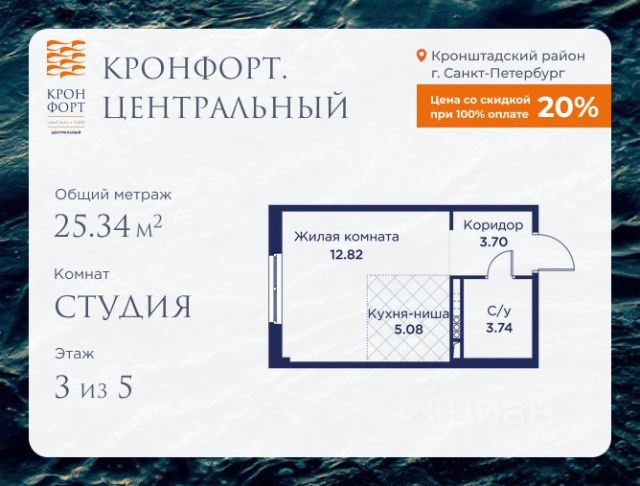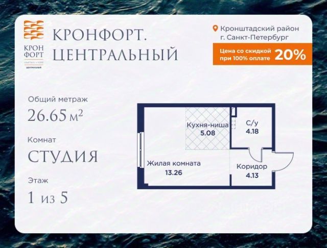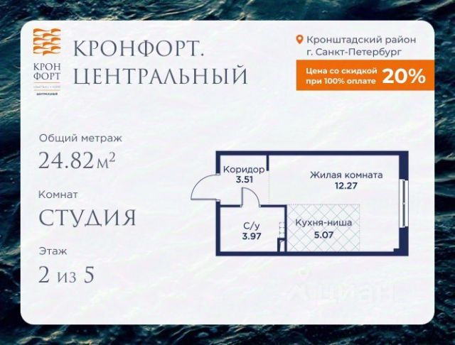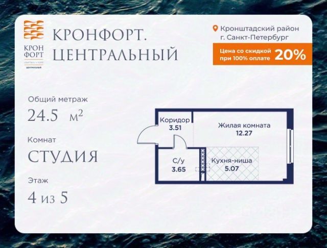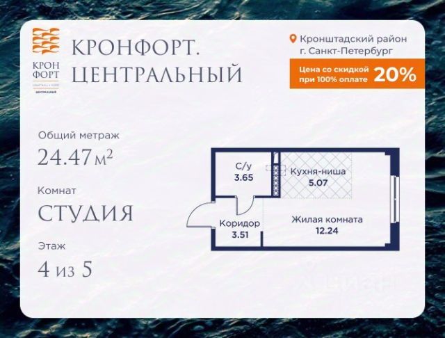 Стоимость квартиры указана со скидкой 20%. Скидка предоставляется при 100% оплате или несубсидированной ипотеке. Предлагается квартира площадью 24.55 кв.м в жилом комплексе "Кронфорт. Центральный" в Санкт-Петербурге (Кронштадт). Возможна покупка с использованием льготных и специальных ипотечных программ с государственной поддержкой. Высота потолков в квартирах — от 3 до 3,4 метров, окна увеличенного размера, есть варианты с эркерами, французскими балконами, лоджиями и террасами. Жилой квартал состоит из пяти четырехэтажных корпусов с закрытыми охраняемыми дворами, свободными от машин. Первые этажи формируют торговые променады в стиле пешеходных улиц исторической части Петербурга и Кронштадта. Внутренние пространства между корпусами — пешеходные зоны с уютными площадями. Архитектурный облик квартала разработан бюро "Проектная культура" и международной компанией Chapman Taylor. Инфраструктура комплекса включает: - Лицей с двумя бассейнами - Детский сад на 150 мест с бассейном и закрытой территорией - Веревочный парк - Игровые площадки для активного отдыха; - Кабинет врача общей практики. - Подземные паркинги с лифтами. - Мусоросборные камеры, индивидуальные кладовые. - Закрытые дворы с контролем доступа и видеонаблюдением. - Мультформатный стрит-ретейл с кафе и ресторанами. - Триатлон-центр и беговые/велодорожки. - Учебно-тренировочный комплекс для детей "Лагерь настоящих героев". Транспортная доступность обеспечивает удобный выезд на КАД (около 1-3 км), 2 минуты пешком до автобусной остановки "Лицей", 25 минут до Сестрорецка, 30 минут до "Лахта-центра", 50 минут до аэропорта "Пулково" и 60 минут до Московского вокзала. Для любителей моря доступен маршрут на "Метеоре" до центра Санкт-Петербурга. Отделка квартир предлагается как с готовой чистовой отделкой, так и со свободной планировкой без отделки для реализации индивидуальных дизайнерских решений. В третьем корпусе, продажи которого стартовали в марте 2025 года, доступны квартиры с просторными террасами, тремя балконами, кухнями-гостиными до 38 кв.м с окнами на две стороны, обеспечивающими панорамное освещение и виды. Если вам нужна помощь с оформлением ипотеки или дополнительная информация по комплексу и условиям покупки, обращайтесь в отдел продаж за консультацией.