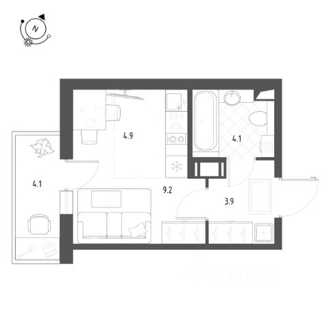 Балкон 4,1 м2, можно разместить дополнительное пространство.