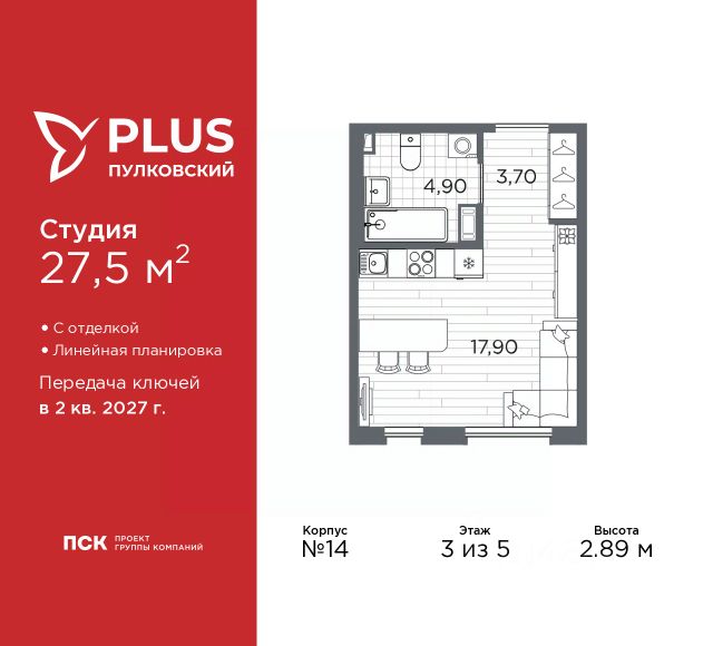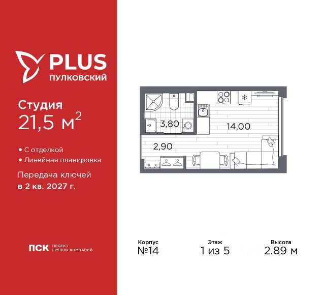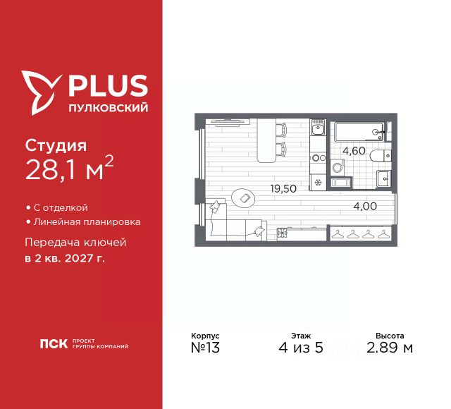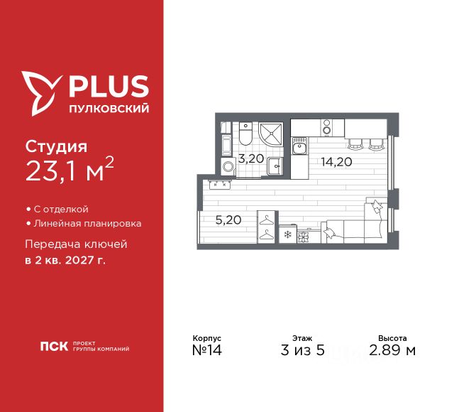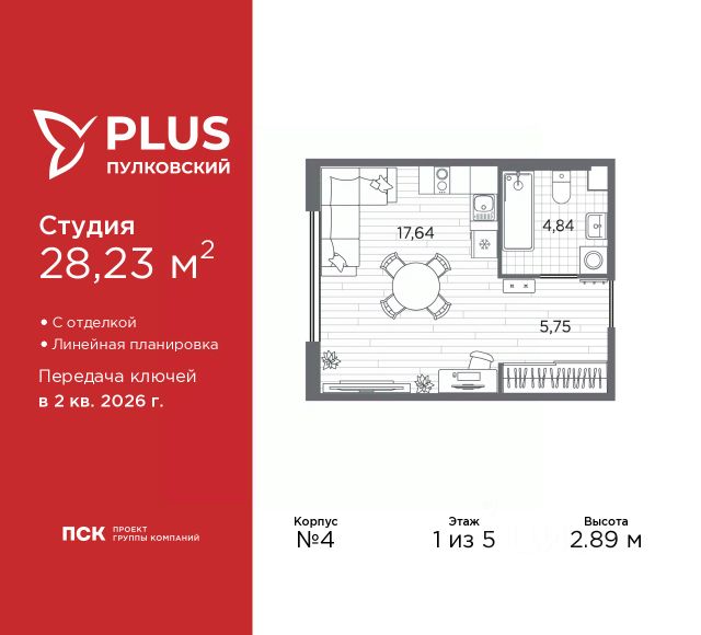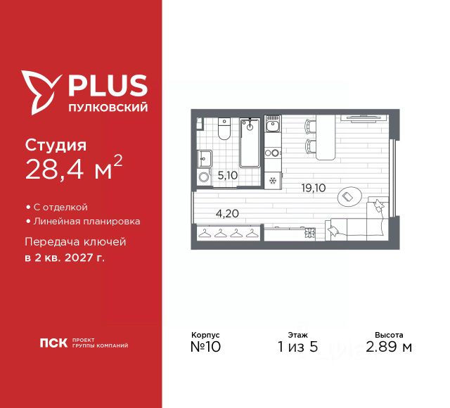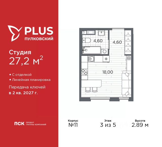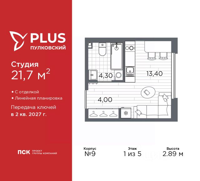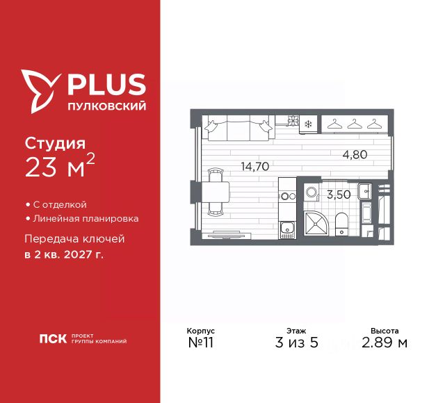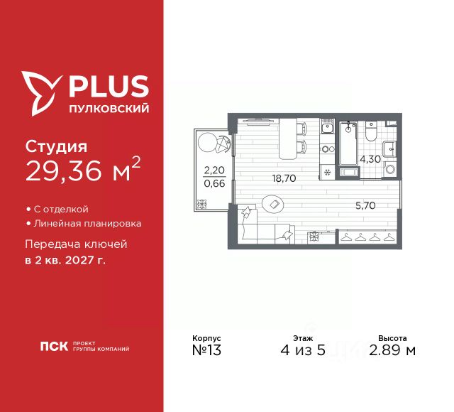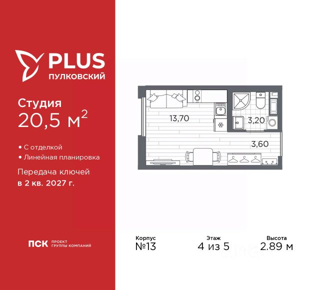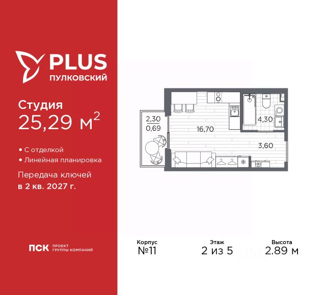 Просторная 1-комн. квартира-студия с отделкой в ЖК "PLUS Пулковский" на 2 этаже. Общая площадь: 22.66 кв.м., площадь гостиной 14.55 кв.м., из которых 5 кв.м. выделено под кухонную зону. Все окна выходят на одну сторону. В квартире один совмещенный санузел. Высота потолков 2.89 м. Дом монолитный, многоподъездный, высотой 5 этажей. Квартира находится в 5-й секции в корпусе 6. На этаже 11 квартир. В подъезде 1 грузовой лифт. Окончание строительства - 2 квартал 2026 года. Оформление сделки по договору долевого участия. Уютный пятиэтажный city квартал PLUS Пулковский расположен в престижном Московском районе на пересечении Пулковского и Волхонского шоссе в новом формирующемся микрорайоне. Рядом проходит одна из важнейших транспортных артерий города Пулковское шоссе, а в 10 минутах езды два въезда на КАД и въезд на ЗСД. Благодаря удобному и быстрому выезду на Пулковское шоссе, можно легко добраться до центра города за 35 мин. До станций метро "Московская" и "Купчино" - 15 мин. на машине, а до аэропорта Пулково - 17 мин. В составе квартала: 30 пятиэтажных домов, школа со спортивным стадионом, 2 детских сада с бассейнами, наземные и подземные паркинги, центральный зеленый бульвар с play hub и местами отдыха. Благоустройство квартала продумано до мельчайших деталей, в его основе - забота о качестве жизни каждого жителя. Дома возводятся по современной монолитной технологии строительства с вентилируемыми фасадами. Благодаря большим увеличенным окнам и отсутствию высокоэтажных домов, во всех квартирах максимальный объем естественного света. В составе квартала запланированы социально-значимые объекты: школа на 825 мест со спортивным стадионом и бассейнами, два детских сада с бассейнами на 220 мест каждый. Территория квартала зонирована таким образом, чтобы автомобильные и пешеходные потоки и не пересекались. Прогулочные и велосипедные дорожки отделены от автомобильных проездов зелеными насаждениями. Дворы закрыты для машин, что дает чувство дополнительной безопасности для жителей особенно, для самых маленьких. Вся территория квартала безбарьерная. Здесь нет пандусов, резких перепадов высот или неудобных ступеней. Вход в парадные с уровня земли. В каждом дворе есть своя оборудованная детская площадка. А в центре микрорайона расположится большая игровая площадка play hub с пространством для командных игр. PLUS Пулковский располагается в молодом микрорайоне, который сейчас находится в стадии активного развития. Он будет обладать собственной развитой инфраструктурой. В радиусе 15 минут езды на автомобиле располагаются многочисленные магазины, супермаркеты, спортивные, образовательные и медицинские учреждения, парки и достопримечательности. Для автомашин предусмотрены отдельно стоящий 5-ти этажный паркинг на 958 машино-мест, две подземные парковки на 367 машино-мест и наземные парковочные зоны по внешнему периметру микрорайона. #2MeZVE