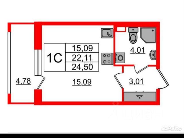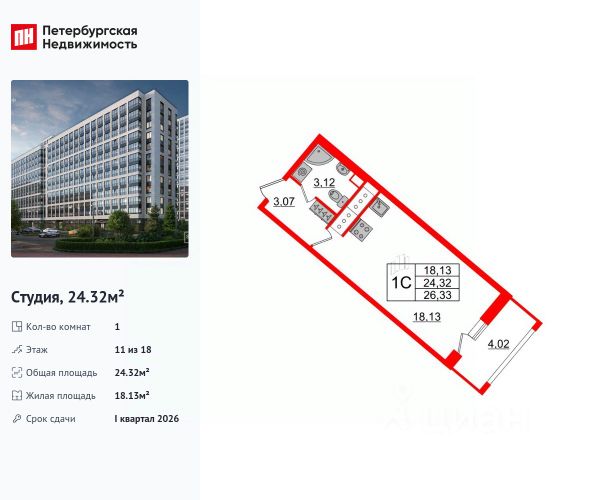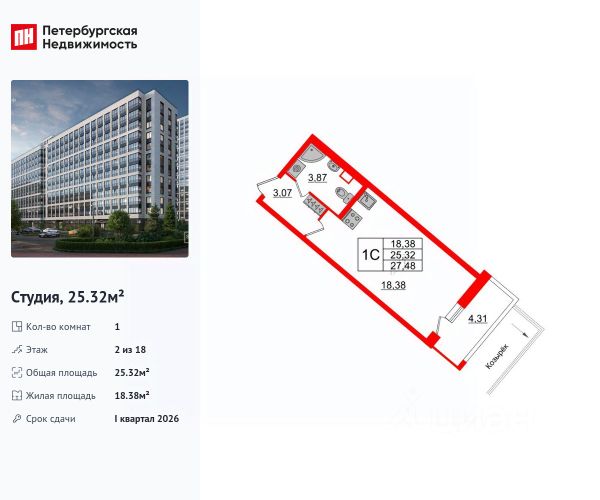 Студия имеет площадь 24,5м + лоджию 4,3м, жилая площадь 18,2 м, имеет наиболее привлекательную лоджию, за счет большей площади остекления на 2 стороны