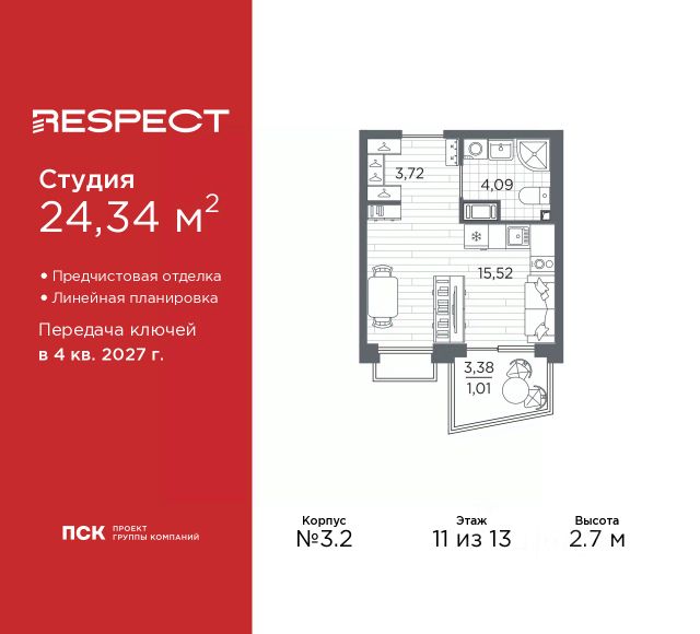 Однокомнатная квартира-студия от застройщика с отделкой в ЖК "RESPECT" на 12 этаже. Общая площадь: 27.67 кв.м., площадь гостиной 17.98 кв.м., из которых 5 кв.м. выделено под кухонную зону. Все окна выходят на одну сторону. В квартире один балкон, один совмещенный санузел. Высота потолков 2.7 м. Дом монолитный, многоподъездный, переменной этажности, от 8 до 13 этажей. Квартира находится в 1-й секции высотой 13 этажей в корпусе 3.3. На этаже 6 квартир. В подъезде 1 пассажирский и 1 грузовой лифт. Начало строительства - 3 квартал 2025 года. Окончание строительства - 4 квартал 2027 года. Оформление сделки по договору долевого участия. В шаговой доступности от жилого комплекса имеются станции метро (расстояние по прямой): "Лесная" (800 м), "Площадь Мужества" (1.4 км), "Выборгская" (1.9 км), также недалеко от этого корпуса находятся станции метро: "Академическая", "Политехническая". Жилой квартал "RESPECT" строится на Полюстровском пр, 87, в одной из самых востребованных локаций Петербурга. В 10 минутах пешком - метро "Лесная" и в 10 минутах на транспорте - Петроградская сторона. Высота домов от 7 до 13 этажей. Квартиры сдаются с отделкой white box и с чистовой отделкой. На территории Respect строится школа на 1125 учащихся и детский сад на 240 мест. Запроектированы собственная газовая котельная, закрытая территория, дворы без машин и подземные паркинги с лифтами. В проекте предусмотрены трапециевидные балконы или остекленные лоджии, которые, с одной стороны, исключают монотонность фасада, являясь декоративными элементами, с другой дополнительным функциональным пространством в квартирах. Цветовая гармония фасадов каждого дома раскрывает характер квартала. Коричневый цвет клинкерного кирпича со структурой водяных штрихов — цвет уюта и безопасности, сдержанности и надёжности. Вентилируемые фасады облицованы клинкерным кирпичом. Его высокая прочность позволяет давать 100 лет гарантии на этот материал. Водопоглощение клинкерного кирпича составляет менее 5%, за счет чего у него высокая теплопроводность и прочность. В квартале запроектированы внутренние закрытые территории дворов домов без доступа автомобилей и безбарьерная среда для велосипедистов и колясок. Предусмотрены IP-домофония с функцией дистанционного открывания калиток и парадных, а также дистанционный сбор показаний счетчиков и мобильное приложение для жителей. Для безопасности жителей квартала - круглосуточное видеонаблюдение и служба охраны. В каждой квартире предусмотрены внешние корзины для кондиционеров. Вся территория квартала будет связана единой концепцией благоустройства, разработанной ландшафтным бюро L.BURO. На эксплуатируемой кровле на уровне первого этажа в домах 1 и 4 будут обустроены общественные видовые террасы. Это станет не только привлекательным местом с красивым видом, но и удобным, многофункциональным пространством. Дизайн парадных зон и входных групп - сочетание лаконичности отделки и декоративных элементов с текстурами из натурального камня и дерева
