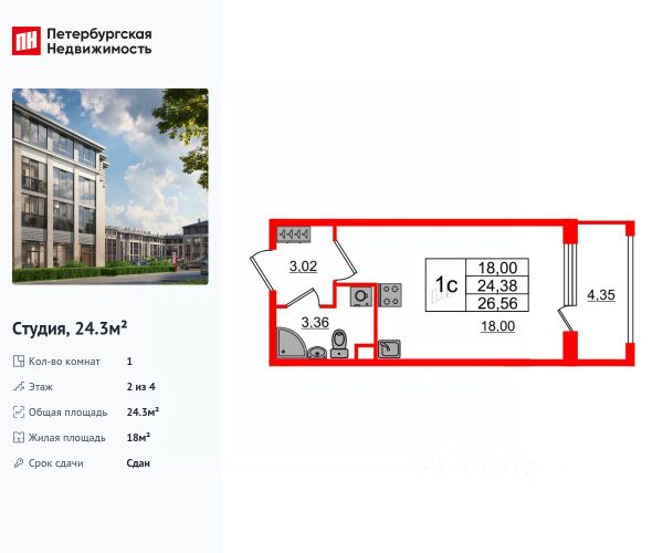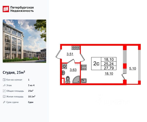 Продается просторная студия от застройщика в жилом комплексе "Дворцовый фасад" в неповторимом Петродворцовом районе. До метро можно добраться на транспорте всего за 25 минут. Удобная, классическая, функциональная европланировка, просторная прихожая 3.51 м². Общая площадь студии - 25 м², жилая 18.1 м², высота потолка 3.07 м. Квартира продается с отделкой "Норд Лайн светлый". Что особенного в ЖК "Дворцовый фасад"? • В окружении дворцово-парковых ансамблей: Стрельна, Константиновский дворец, Петергоф, парк Новознаменка и Сосновая поляна, Шунгеровский лесопарк • Два собственных парка: парадный верхний для спокойного отдыха, нижний для активных занятий • Проект, соответствующий стандартам экологичного строительства, энергоэффективности, экономии и комфорта • Квартиры с саунами, возможностью установки камина и палисадниками • Малоэтажный жилой комплекс: всего 4 этажа, более половины квартир с увеличенной высотой потолка: от 3 до 5,5 м