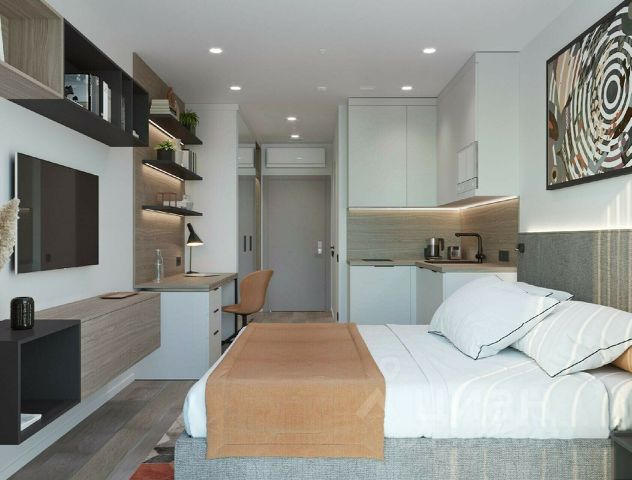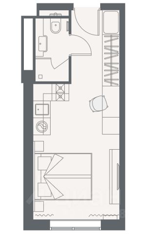 Широкая планировка, что позволяет зонировать пространство на функциональные зоны - при входе удобно расположится вместительны шкаф с распашными дверьми, зона кухни будет отделена удобным островом, здесь же с комфортом разместится рабочая зона и полноценная двуспальная кровать. Санузел объединен, здесь будет установлена инсталляция и душевой трап.