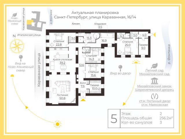 Редкий пентхаус с видом на воду! Один на этаже. 9 больших окон выходят на Неву. 6 спален. Зона Maid's с отдельным входом. Потолки 3,3 м. Приватный корпус на 6 квартир! Отдельное лобби с видом на прогулочную набережную. Все продуманно для роскошной и комфортной жизни. Для Вас четыре огромных парковочных места прямо у парадной. И из паркинга только Вы приезжаете к себе на этаж, то есть весь приквартирный холл только для Вас — это дополнительно ~ 30 м² для Вашего пользования. Сама планировка продуманна и включает в себя пять мастер спален, большую кухню-гостиную с видом на воду, два балкона с видом на внутреннюю территорию комплекса и Крестовский. В квартире два входа — один парадный для Вас, второй можно использовать для обслуживающего персонала, няни или когда подрастет ребенок отделить для него свое пространство! Семь ванных комнат, четыре из которых с окнами! На первом этаже для Вас стильное лобби с уютной диванной зоной и видом на набережную, Неву и яхты! "Петровская доминанта" — это бизнес-класс на первой линии Невы. Своя прогулочная набережная, променад и в скором времени обзорная площадка и площадь с фонтаном в яхт-клубе! Архитектор проекта — известное архитектурное бюро Intercolumnium. Клинкерный кирпич, натуральный юрский камень, черненый металл, стекло, декоративные элементы в отделке фасадов. Стильный дизайн внутренних дворов, детские и спортивные площадки, зоны отдыха с изящными светильниками является частью общей концепции комплекса. Частью комплекса является и собственный детский сад, расположенный на закрытой, охраняемой и обособленной территории. Безопасность на высшем уровне. Надежная охрана, системы видеонаблюдения, контроля и управления доступом — все здесь призвано обеспечить Ваш покой и уединение. Общая площадь 284,4 м² + балконы 5,6 м² + 5,6 м² (приведенная площадь = 3,4 м²) Стоимость за метр рассчитана включая приведенную площадь.