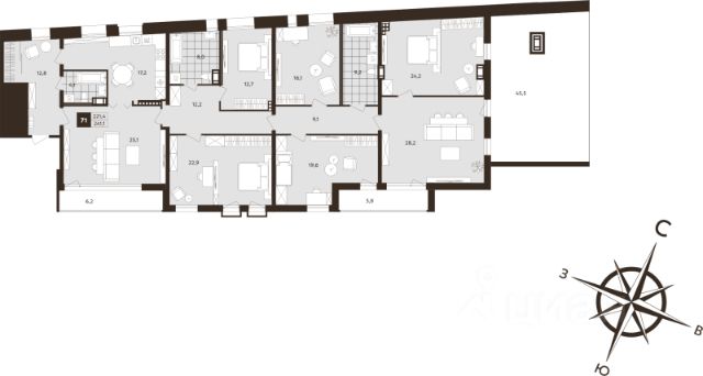 Продаётся 7-комнатная квартира в сданном доме (Корпус 2), срок сдачи: IV-кв. 2025, общей площадью 221.4 кв.м., на 9 этаже. Новый дом построен в историческом центре Петербурга в 3 мин от метро Технологический институт. В нём всего 163 квартиры с просторными планировками (31 до 241 м2). Корпуса высотой 6-9 этажей. На нижних этажах окна квартир выходят в тихие, уютные дворы. С балконов и террас верхних этажей открываются виды на крыши старого города, Исаакиевский и Троице-Измайловский соборы, часовую башню Астрономической обсерватории Главной палаты мер и весов. Доступ на территорию жилого комплекса закрыт для посторонних. Во внутренних дворах разместились игровые площадки для детей разных возрастов, зоны для отдыха и занятий спортом. Входы в парадные находятся со стороны внутренних дворов. На территории и первых этажах ведется видеонаблюдение, организован круглосуточный пост охраны. В центральном лобби размещена консьерж-служба. Под территорией ЖК расположен двухуровневый подземный паркинг на 163 машиноместа. Из паркинга в свою парадную можно подняться на комфортабельном лифте. Также для жителей доступны кладовые помещения на подземных и первом этажах. В сердце Санкт-Петербурга Дом расположен в 1-2 минутах пешком до сада Олимпия и Московского проспекта. В 3 минутах - станция метро Технологический институт. За 9-10 минут от парадной можно дойти до набережной Фонтанки, за 15 минут доехать на авто до Эрмитажа или Мариинского театра. Рядом расположились престижные школы, вузы. В шаговой доступности - питерские рестораны и кафе, фитнес-центры, парки и театры.
