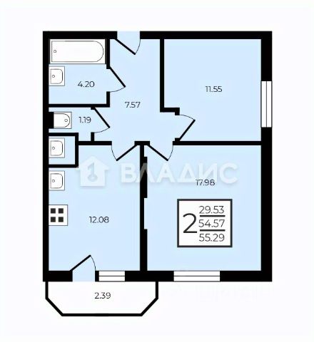 Имеет две лоджии 1,2 кв.м. и 1,1 кв.м.