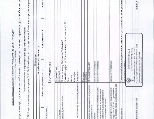 Данные получены с сайта ГИС Торги. Квартира, расположенная по адресу: Санкт-Петербург, ул. Композиторов, д. 9, литера А, кв. 225 общ. пл. 39,1 кв.м. кад 78:36:0005508:4890
