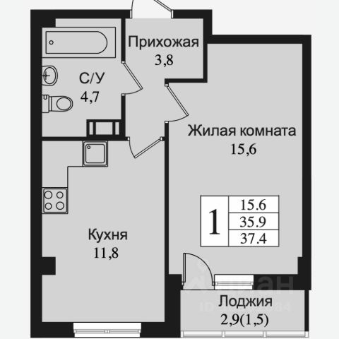 В продаже квартира площадью 35 кв. м без отделки на 16 этаже 16 этажного дома. Квартира находится в 5 корпусе: