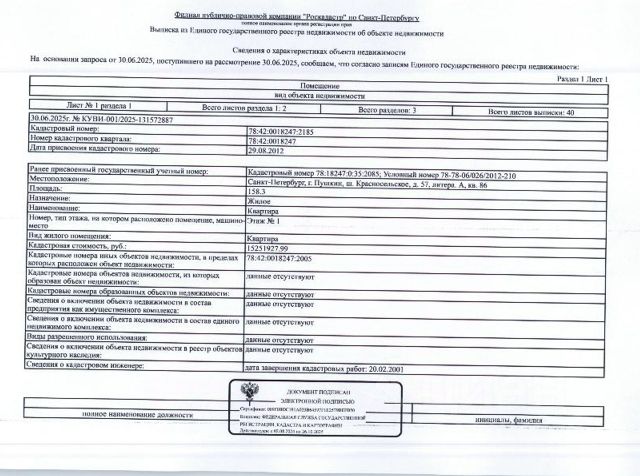 Данные получены с сайта ГИС Торги. квартира по адресу: г. Санкт-Петербург, г. Пушкин, Красносельское ш., д.57, лит. А, кв. 86, общ. пл. 158,3 кв.м., кадастровый номер 78:42:0018247:2185