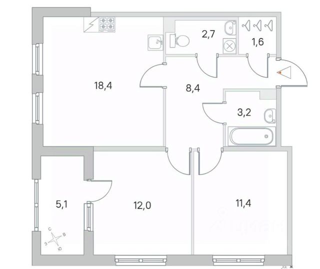 Просторная прихожая 10,2 м, кухня 12,1 м, комнаты 16 м и 15,8 м, санузел раздельный.