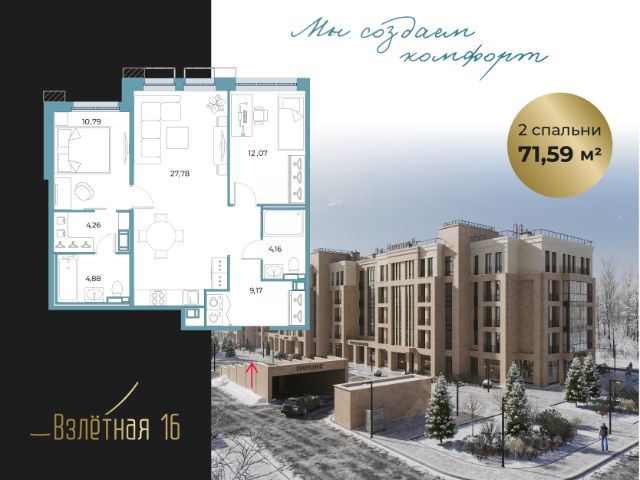 В его состав входят два 18-этажных корпуса с видами на Колтушские высоты, сервисы повседневной инфраструктуры, собственный приватный двор, просторный паркинг для жителей и гостей. Девелопер проекта - федеральный застройщик ГК "Развитие".