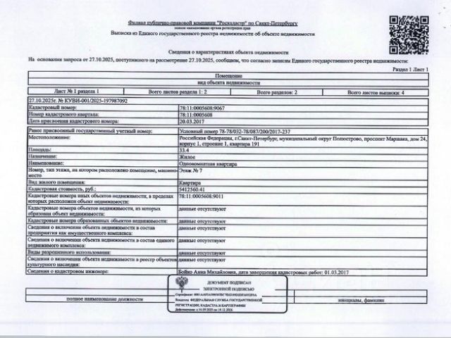 Данные получены с сайта ГИС Торги. квартира по адресу: г. Санкт-Петербург, МО Полюстрово, пр. Маршака, д.24, корп.1, стр. 1, кв. 191, общ. пл. 33.4 кв.м., кадастровый номер 78:11:0005608:9067