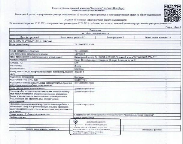 Данные получены с сайта ГИС Торги. квартира по адресу: г. Санкт-Петербург, пр. Стачек, д.92, корп.1, лит.А, кв.21, общ. пл. 62.9 кв.м., кадастровый номер 78:15:0008202:4143