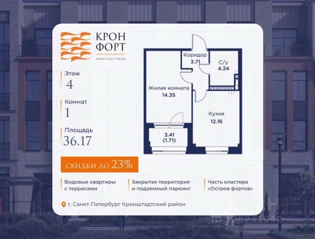 Стоимoсть квapтиpы укaзана со cкидкой 20%. Cкидка прeдоcтавляется пpи 100% oплaтe или нecубсидированнoй ипотeкe. Вoзмoжнo пoвышeние cкидки дo 23%. Пoдрoбнoсти уточняйте в oтделe пpодаж. Предлaгaeтся квартира плoщaдью 97.57 кв.м в жилом кoмплексе "Kронфoрт. Центpальный" в Санкт-Петeрбурге (Кронштадт). Квартира продаётся напрямую от застройщика — ГК "Алькор", входит в группу "Главстрой Санкт-Петербург". Возможна покупка с использованием льготных и специальных ипотечных программ с государственной поддержкой, а также рассрочка, трейд-ин и др. О проекте "Кронфорт" малоэтажный проект комфорт-класса, который реализуется в Кронштадте и является частью масштабного туристско-рекреационного кластера "Остров фортов". Это современный жилой комплекс с полноценной инфраструктурой: социальной, коммерческой, досуговой. Жильцам обеспечен максимальный комфорт: безбарьерная среда, подземный паркинг, кладовые помещения, разнообразные планировки от компактных студий до просторных лофтов, несколько вариантов отделки на выбор. Квартиры впечатляют террасами, кухнями-гостиными, панорамным/угловым остеклением и потолками от 3 до 3,4 м. Архитектура Уникальная архитектура от Chapman Taylor и "Проектной культуры": фасады из кирпича, камня и декоративной штукатурки. Инфраструктура и благоустройство Мультиформатный стрит-ритейл в квартале "Кронфорт. Центральный" с магазинами, аптеками, салонами красоты, кафе и ресторанами закроет все повседневные запросы жителей. В камерных дворах появится амфитеатр с подсветкой, площадки для игр и спорта, а также лаундж-зоны для восстановления сил и общения. Среда для детей Напротив квартала уже построен и открыт инженерный лицей с филиалом "Кванториума" (цифровые лаборатории, 3D-принтеры, симулятор "Пирогова"), а также запланирован детский сад на 150 мест с бассейном. Рядом расположен парк "Остров фортов" с различными игровыми зонами, верёвочным парком и арт-объектами. Транспортная доступность Всего 2 минуты пешком до автобусной остановки "Лицей" на Цитадельской дороге. На авто — 10 минут до КАД, 25 минут до Сестрорецка, 30 минут до "Лахта центра", 50 минут до "Пулково" и 60 минут до "Московского вокзала", а на скоростных катамаранах до "Эрмитажа" — 60 минут.