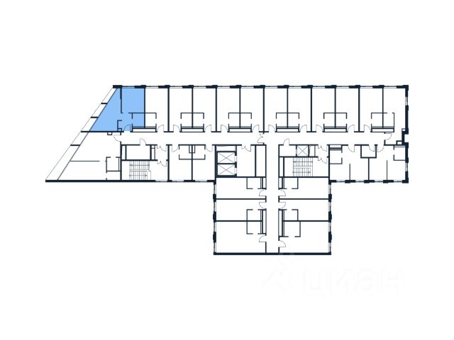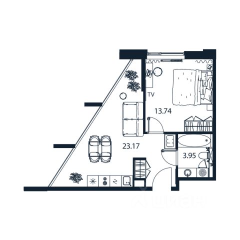— Планировка — свободная и гибкая. Пространство делится на две зоны: спальня, совмещённая с кухней, и отдельный кабинет — можно использовать под рабочую зону или переоборудовать под личные нужды.