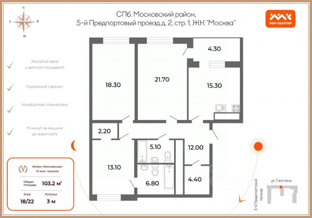 Метро Московская находится в 15 минутах ходьбы, до аэропорта Пулково (10 км.), КАД, ЗСД можно быстро доехать на автомобиле.