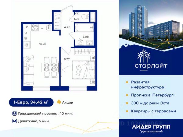 Срочно продается однокомнатная квартира в ЖК Новая Охта (г. Санкт-Петербург, Муринская дорога,84) Городская прописка !