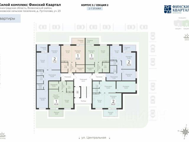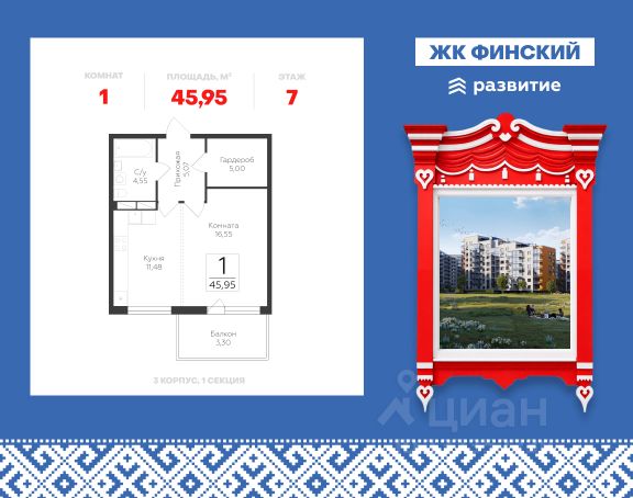 Продается 1-комнатная квартира 45,95 кв.м. на 7 этаже. В продаже квартира в жилом комплексе комфорт-класса "Финский квартал".