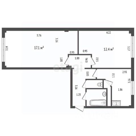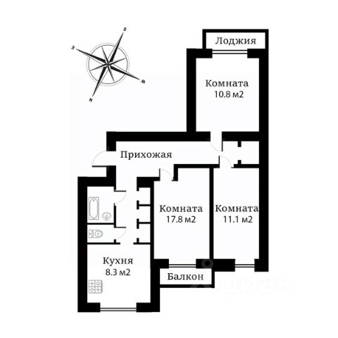 - Раздельные жилые комнаты правильной формы и хорошей квадратуры. (17,2 м2 и 14,9 м2)