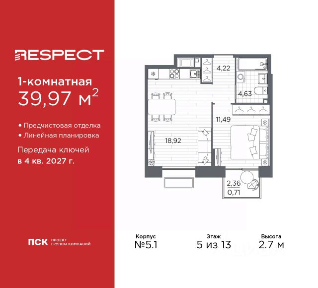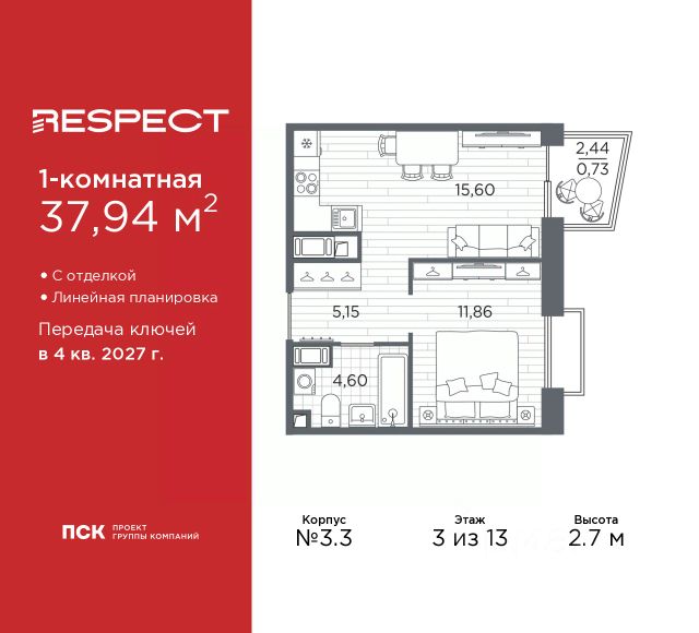 Продается 2-комн. квартира от застройщика с предчистовой отделкой в ЖК "RESPECT" на 8 этаже. Общая площадь: 62.02 кв.м., жилая: 28.48 кв.м., площадь просторной кухни-столовой: 14.47 кв.м. Комнаты изолированные, все окна выходят на одну сторону. В квартире один балкон и одна лоджия, один совмещенный и один раздельный санузел. Высота потолков 2.7 м. Дом монолитный, многоподъездный, переменной этажности, от 10 до 13 этажей. Квартира находится в 1-й секции высотой 13 этажей в корпусе 3.2. На этаже 5 квартир. В подъезде 1 пассажирский и 1 грузовой лифт. Начало строительства - 3 квартал 2025 года. Окончание строительства - 4 квартал 2027 года. Оформление сделки по договору долевого участия. В шаговой доступности от жилого комплекса расположены станции метро (расстояние по прямой): "Лесная" (800 м), "Площадь Мужества" (1.4 км), "Выборгская" (1.9 км), также недалеко от этого корпуса расположены станции метро: "Академическая", "Политехническая". Жилой квартал "RESPECT" строится на Полюстровском пр, 87, в одной из самых востребованных локаций Петербурга. В 10 минутах пешком - метро "Лесная" и в 10 минутах на транспорте - Петроградская сторона. Высота домов от 7 до 13 этажей. Квартиры сдаются с отделкой white box и с чистовой отделкой. На территории Respect строится школа на 1125 учащихся и детский сад на 240 мест. Запроектированы собственная газовая котельная, закрытая территория, дворы без машин и подземные паркинги с лифтами. В проекте предусмотрены трапециевидные балконы или остекленные лоджии, которые, с одной стороны, исключают монотонность фасада, являясь декоративными элементами, с другой дополнительным функциональным пространством в квартирах. Цветовая гармония фасадов каждого дома раскрывает характер квартала. Коричневый цвет клинкерного кирпича со структурой водяных штрихов — цвет уюта и безопасности, сдержанности и надёжности. Вентилируемые фасады облицованы клинкерным кирпичом. Его высокая прочность позволяет давать 100 лет гарантии на этот материал. Водопоглощение клинкерного кирпича составляет менее 5%, за счет чего у него высокая теплопроводность и прочность. В квартале запроектированы внутренние закрытые территории дворов домов без доступа автомобилей и безбарьерная среда для велосипедистов и колясок. Предусмотрены IP-домофония с функцией дистанционного открывания калиток и парадных, а также дистанционный сбор показаний счетчиков и мобильное приложение для жителей. Для безопасности жителей квартала - круглосуточное видеонаблюдение и служба охраны. В каждой квартире предусмотрены внешние корзины для кондиционеров. Вся территория квартала будет связана единой концепцией благоустройства, разработанной ландшафтным бюро L.BURO. На эксплуатируемой кровле на уровне первого этажа в домах 1 и 4 будут обустроены общественные видовые террасы. Это станет не только привлекательным местом с красивым видом, но и удобным, многофункциональным пространством. Дизайн парадных зон и входных групп - сочетание лаконичности отделки и декора