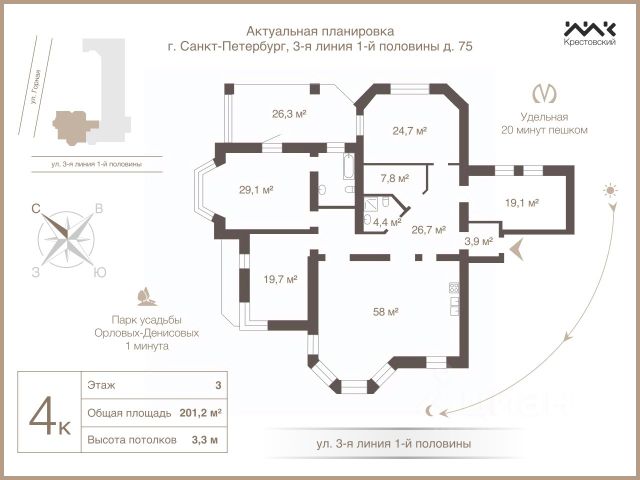 Арт. 116522543 Редкое предложение в Коломягах. Эта квартира с премиальным ремонтом, камином, зимним садом и собственным гаражом на две машины — то пространство, где уют и статус соединяются с впечатляющей архитектурой. Благодаря трёхсторонней планировке, большому количеству панорамных окон и высоким потолкам 3,5 метра квартира всегда наполнена светом и воздухом. Продуманная планировка включает просторную кухню-гостиную 58 м² с эркером и камином из мрамора, приватную зону из трёх спален (одна из них — мастер-спальня) и отдельный кабинет. Французские балконы, два санузла и отдельное техническое помещение создают максимальное удобство для жизни. А просторный зимний сад с видом на закат и панорамным остеклением может стать одним из любимых мест в вашем новом доме. Квартира полностью готова к заселению: новому владельцу остаётся итальянская мебель из массива, немецкая техника (Kuppersbusch и Libherr), массивная доска на полу, подоконники из кварцевого агломерата, итальянские шпонированные двери. Квартира находится на третьем этаже "Дома с Птицами" — архитектурной доминанты района "Никитинская усадьба", объединяющей традиционные петербургские мотивы и современные технологии. Его шпили, башни и детали фасада создают неповторимый облик. В доме всего 17 квартир. "Никитинская усадьба" — зелёный район с малоэтажной застройкой, уютными закрытыми дворами вдали от шума мегаполиса. Коломяги - это особый образ жизнь сочетающий загородную атмосферу в черте города. Для полноценной жизни здесь есть всё: ухоженные парки для прогулок, пруды, современные спортивные площадки, продуктовые магазины, школы и детские сады, рестораны и SPA-салоны. Развитая инфраструктура и удобные транспортные развязки позволяют быстро добраться до любых уголков города без потери времени на дороге. Готовы к предложениям по цене. Звоните, чтобы узнать детали и договориться о просмотре! Купить квартиру (вторичка) на линии 3-я 1-й половины в Санкт-Петербурге.