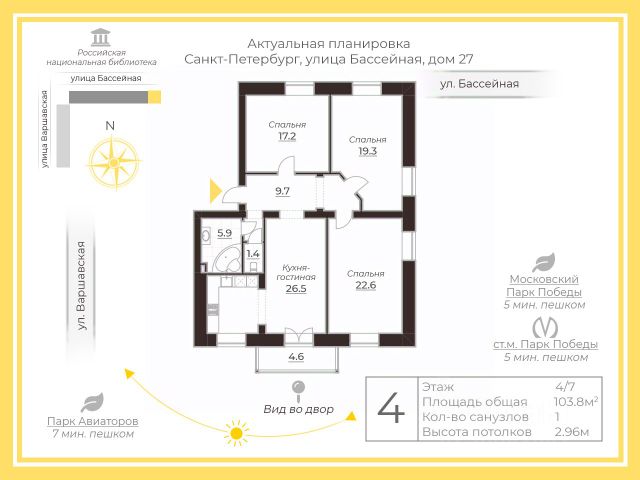 Продается трехкомнатная квартира на углу Московского проспекта и Бассейной улицы, всего в двух минутах ходьбы от метро Парк Победы. Общая площадь квартиры 66 кв.м., совмещенная кухня с гостиной, спальня, зонированная детская комната и гардеробная. Перепланировка полностью узаконена. Квартира расположена на 2-м этаже шестиэтажного кирпичного дома 1953 года постройки. Высокие потолки 3.40 м. Дом со шпилем или Генеральский дом - единственная сталинская высотка в нашем городе. В нём прошла юность легенды отечественной рок-музыки Виктора Цоя. Здание в отличном состоянии. За последний год поменян лифт и сделан капитальный ремонт фасада и парадной. Окна выходят на самый лучший парк города - Парк Победы, большой зелёный двор, где всегда можно припарковать автомобиль, всё необходимое в шаговой доступности. В квартире сделан качественный евроремонт с заменой внутренней штукатурки, полов и потолка. Дубовые двери (высота 2.20), дубовые подоконники и плинтусы. Деревянные окна, форточки с шумоподавлением. Пол паркетный. Двухуровневые потолки с закарнизной подсветкой. Раздельный санузел. Большая (180 см) чугунная французская ванна Jaсob Delafon, тропический душ. Кухня со встроенной немецкой техникой и теплым полом. Квартира продается без посредников от собственника. Обременения отсутствуют. Вся мебель и техника останется покупателям. Продается квартира на вторичном рынке на улице Бассейная в Санкт-Петербурге.