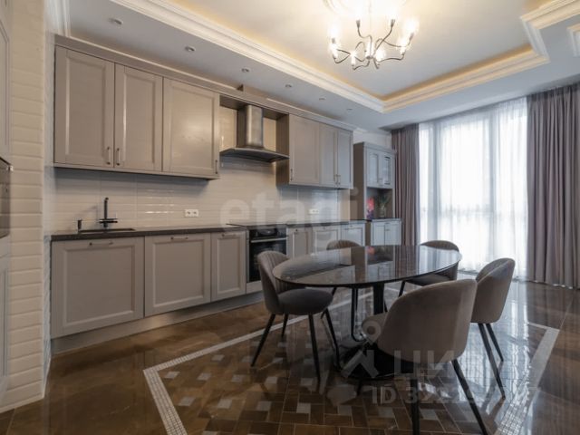 Кухня премиум-класса, совмещена с гостиной. Оборудована встроенной техникой: варочная панель, духовой шкаф, ПММ от Miele, холодильник Smeg. Окна выходят во внутренний двор, есть выход на закрытый балкон с теплым полом. Гостиная обустроена дорогой итальянской мебелью, которая специально подбиралась в Италии. Телевизор Sony с диагональю 75".