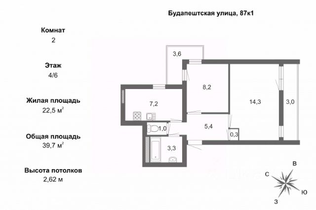 - высота потолка 2,6 метра