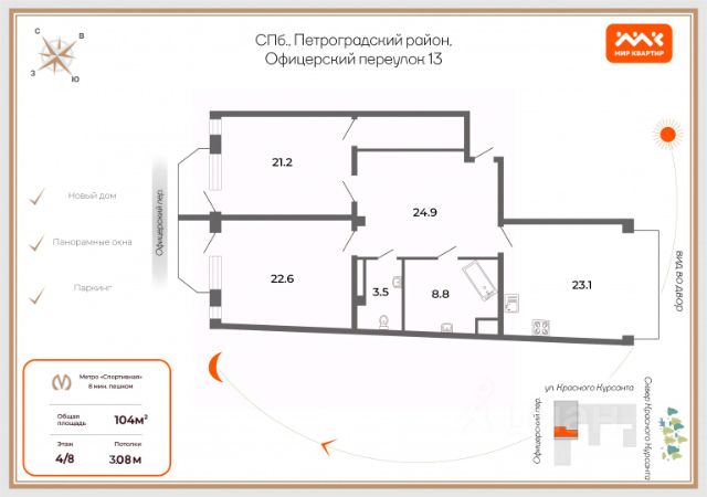 Продаётся светлая, просторная, видовая квартира свободной планировки в респектабельном Петроградском районе. !!!Доступна в покупку в рассрочку от продавца. За условиями - пишите в директ!!! Квартира двусторонняя: окна выходят на переулок Офицерский и тихий внутренний двор, а благодаря расположению на 8-м этаже открываются потрясающие панорамные виды на знаковые архитектурные доминанты Санкт-Петербурга: Петропавловскую крепость, Князь-Владимирский собор, Исаакиевский собор, башню Лахта Центра и Газпром Арену. Квартира включает три комнаты, однако возможна перепланировка: просторная гостиная площадью 46 м² с большим арочным окном может быть преобразована в роскошную кухню-гостиную. Высокие потолки (3 м) создают ощущение простора, а удачное расположение спален во двор обеспечивает тишину и комфорт. О доме Дом построен в 2018 году по индивидуальному проекту с использованием кирпично-монолитной технологии, что гарантирует отличную шумо- и теплоизоляцию. В подъезде действует собственная диспетчерская служба, предусмотрены колясочная, велопарковка и уютная зона отдыха. Установлены бесшумные немецкие лифты Stein, работает консьерж-служба, обеспечено круглосуточное видеонаблюдение. ТСЖ эффективно управляет домом, поддерживая его в безупречном состоянии. Особенность дома — эксплуатируемая кровля с террасой и смотровой площадкой самая высокая точка Петроградского района. Отсюда открываются виды на закаты, салюты и архитектуру города. Инфраструктура и транспортная доступность Дом расположен в тихой части Петроградского района, в пешей доступности от центра. Поблизости: • Детские сады, • Школа 77, • Гимназия 610, • Центр развития детей и подростков (находится прямо в доме). Для прогулок и активного отдыха рядом — Петровский парк и теннисные корты на набережной. Отличная транспортная доступность: • Станции метро: Спортивная и Чкаловская • Удобный выезд на мост Бетанкура и ЗСД Дополнительная информация • Общая площадь: 144,4 м² • Площадь кухни: 22,2 м² (возможна перепланировка) • Высота потолков: 3 м • Санузлы: 1 совмещённый, 1 раздельный • Вид из окон: на улицу и во двор • Состояние: без ремонта • Тип дома: кирпично-монолитный • Парковка: подземная • Отопление: автономная котельная • Собственник: один взрослый • Продажа: прямая, без обременений, быстрый выход на сделку Эта квартира — идеальный выбор для ценителей уюта, комфорта и потрясающих видов на исторический центр Санкт-Петербурга. Продается квартира на вторичном рынке в переулке Офицерский в Санкт-Петербурге.