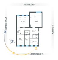 Комнаты в квартире раздельные. Окна выходят на юг и север. Из большой комнаты выход на застекленную и утепленную лоджию площадью 5,3 кв. м . Она такая просторная, что можно разместить тренажер для занятий спортом. В холле и кухне полы с подогревом и облицованы кафельной плиткой. Широкие окна оборудованы стеклопакетами со шторками. Просторный, в плане квадратный, холл разделяет комнаты, а санузел раздельный.