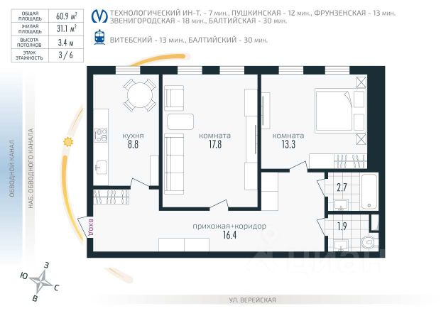 Пушкинская, Технологический институт в 5 минут пешком от Верейской улицы,